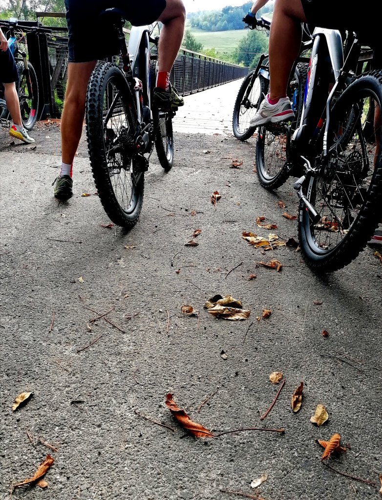 Nonostante questo, tra uno sguardo al terreno accidentato e un pedale che sbatteva sul polpaccio, ho cercato di fare amicizia con la mia bici e mi sono goduta il percorso. E allora, a poco a poco, ho iniziato a sentire quel meraviglioso profumo di sottobosco, di terra umida e foglie, l’odore dei fiori di campo, ho sentito il vento in faccia durante le discese, divisa tra la gioia pura e la paura di cadere. Ho ascoltato il rumore sotto le ruote, diverso ad ogni cambio di terreno: ghiaia sottile, grandi ciottoli, fango, asfalto, erba. Ho provato una profonda gratitudine per quel bicchiere di vino bianco e fresco, per il pranzo buono e i dolci deliziosi. Ho riso con i miei compagni. Ho fotografato.