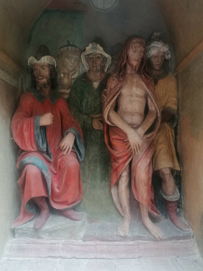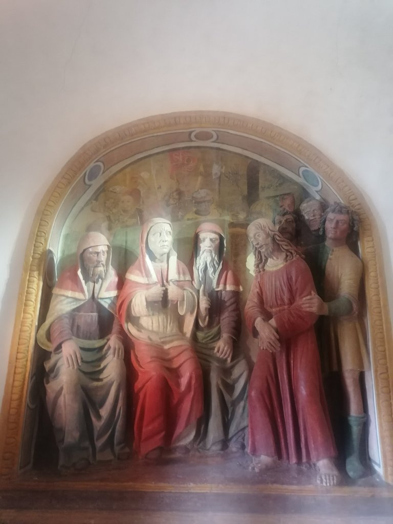Guido, così scopriremo poi che si chiama, mi ha già conquistata. Ci accompagna come un giovane San Pietro, con un grande mazzo di chiavi in mano, in ogni edificio del pellegrinaggio. Una chiave per ogni porta che apre per condurci all’interno: qui si trovano opere che fatico a definire: un mix di affreschi e sculture in terracotta che lui chiama Mélange. Si tratta di opere che servivano ai fedeli per comprendere l’episodio narrato e i simboli che esso nascondeva: per fare questo in modo efficace, agli elementi tipici del I secolo, epoca nella quale si svolgono gli eventi, si aggiungono particolari della Toscana rinascimentale, più facilmente leggibili dal pubblico del tempo. Guido ripete spesso la parola marketing. E ha ragione: chi percorreva il cammino che era stato di Gesù, dal processo, alla crocifissione, poteva riconoscere un linguaggio familiare, una storia avvincente ed esotica e allo stesso tempo facilmente leggibile. Facendo questo pellegrinaggio toscano, i fedeli si sentivano come a Gerusalemme e tornavano a casa con una fede rinnovata e ravvivata dai colori vivaci, pronti a farsene portavoce entusiasti.